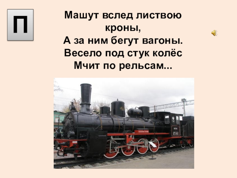 Машут вслед листвою кроны, А за ним бегут вагоны. Весело под стук колёс Мчит по рельсам... П