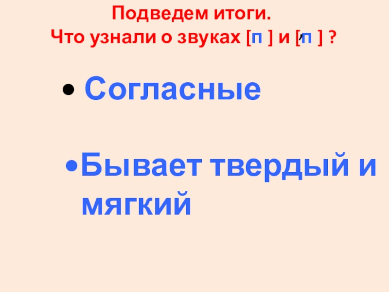 Подведем итоги.  Что узнали о звуках [п ] и [п ] ?  СогласныеБывает твердый и