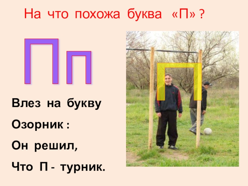 Пп П Влез на буквуОзорник :Он решил,Что П - турник.На что похожа буква  «П» ?
