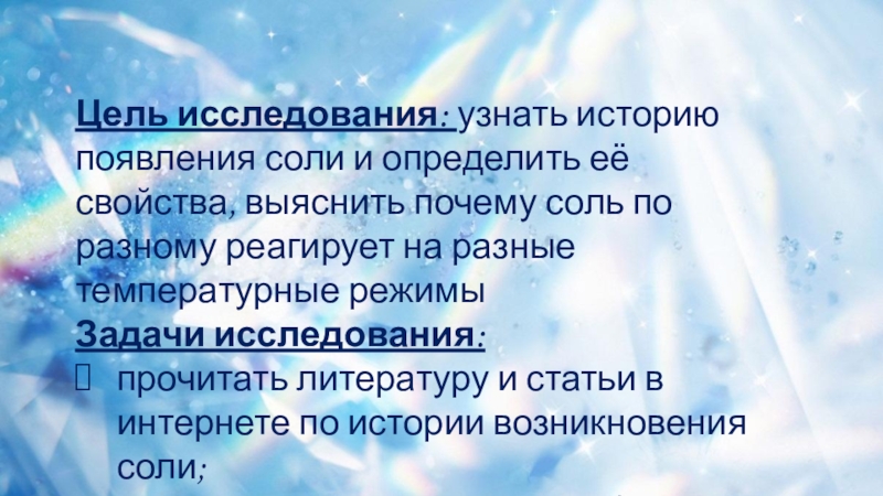 Цель исследования: узнать историю появления соли и определить её свойства, выяснить почему соль по разному реагирует на