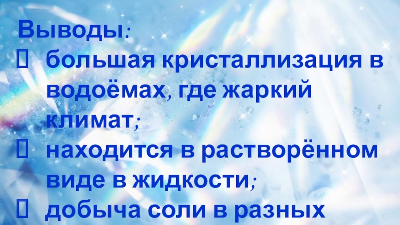 Выводы:большая кристаллизация в водоёмах, где жаркий климат;находится в растворённом виде в жидкости;добыча соли в разных видах промышленности.