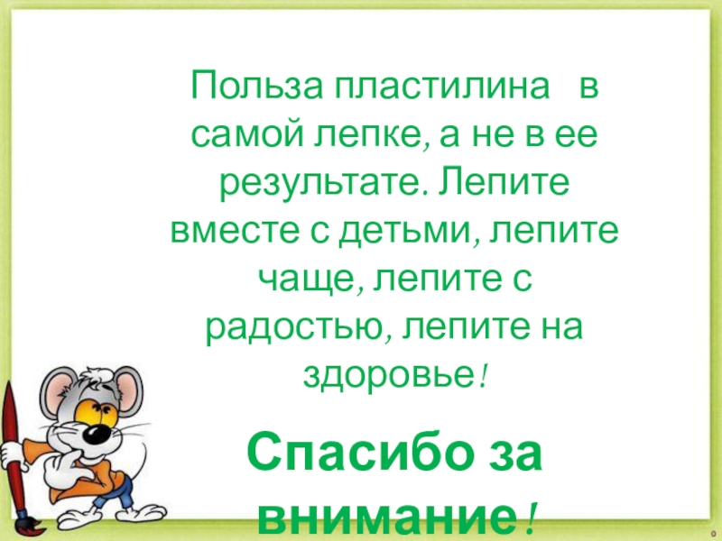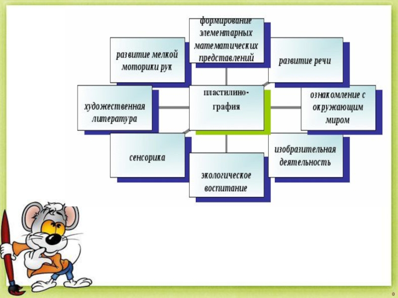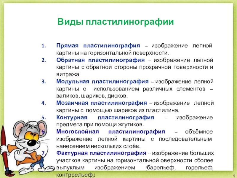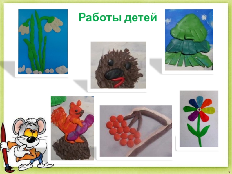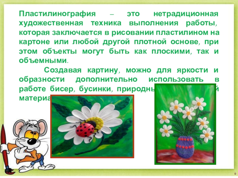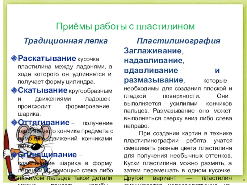 При создании картин в технике пластилинографии ребята учатся смешивать разные цвета пластилина для получения необычных оттенков. Куски пластилина можно размять, а затем перемешать в одном кусочке. Другой вариант — пластилин смешивается непосредственно на основе, мазки накладываются поочередно и размазываются на поверхности.