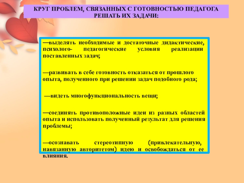 КРУГ ПРОБЛЕМ, СВЯЗАННЫХ С ГОТОВНОСТЬЮ ПЕДАГОГА РЕШАТЬ ИХ ЗАДАЧИ: