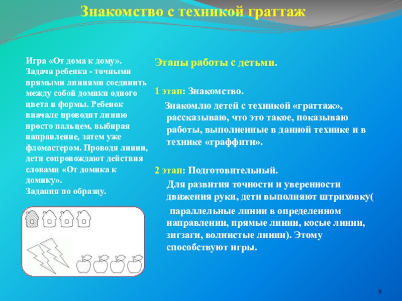 Игра «От дома к дому». Задача ребенка - точными прямыми линиями соединить между собой домики одного цвета и формы. Ребенок вначале проводит линию просто пальцем, выбирая направление, затем уже фломастером. Проводя линии, дети сопровождают действия словами «От домика к домику».
