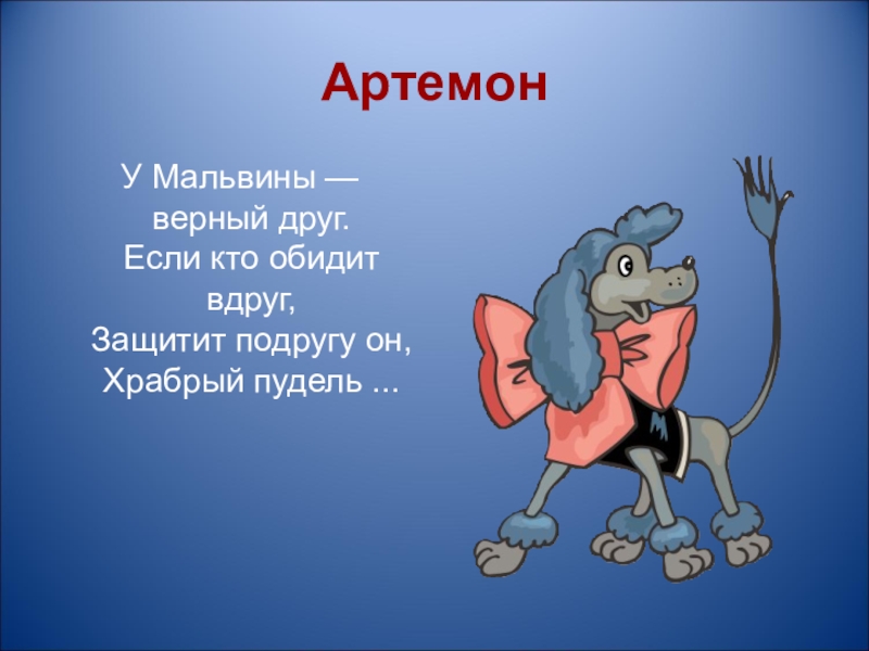 Артемон У Мальвины — верный друг. Если кто обидит вдруг, Защитит подругу он, Храбрый пудель ...