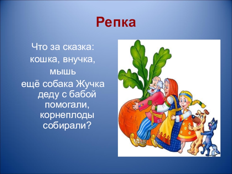 РепкаЧто за сказка:кошка, внучка,мышьещё собака Жучка деду с бабой помогали, корнеплоды собирали?