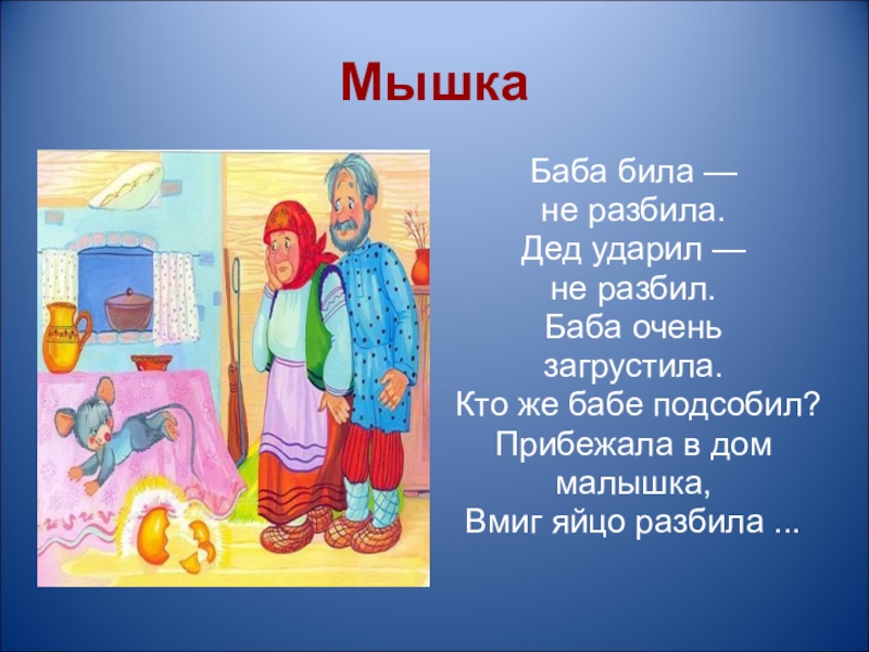 МышкаБаба била — не разбила.Дед ударил — не разбил.Баба очень загрустила.Кто же бабе подсобил?Прибежала в доммалышка,Вмиг яйцо