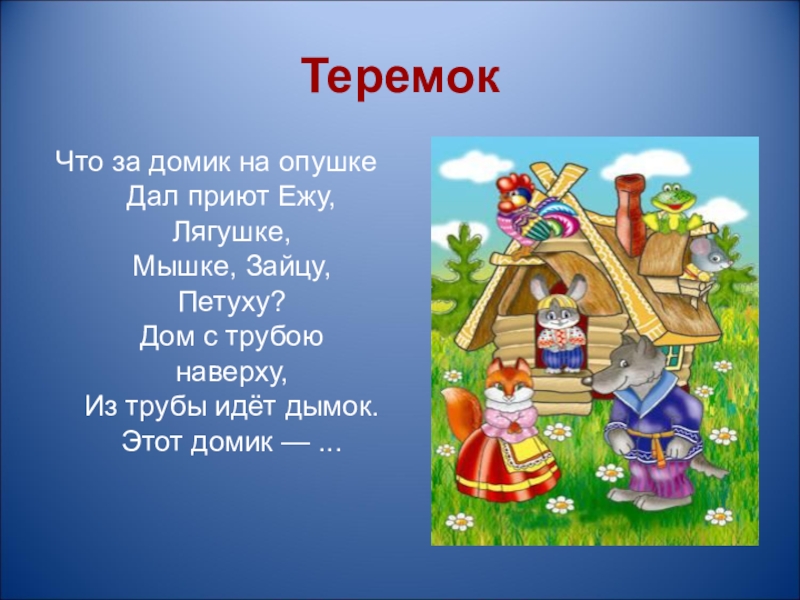 ТеремокЧто за домик на опушке Дал приют Ежу, Лягушке, Мышке, Зайцу, Петуху? Дом с трубою наверху, Из