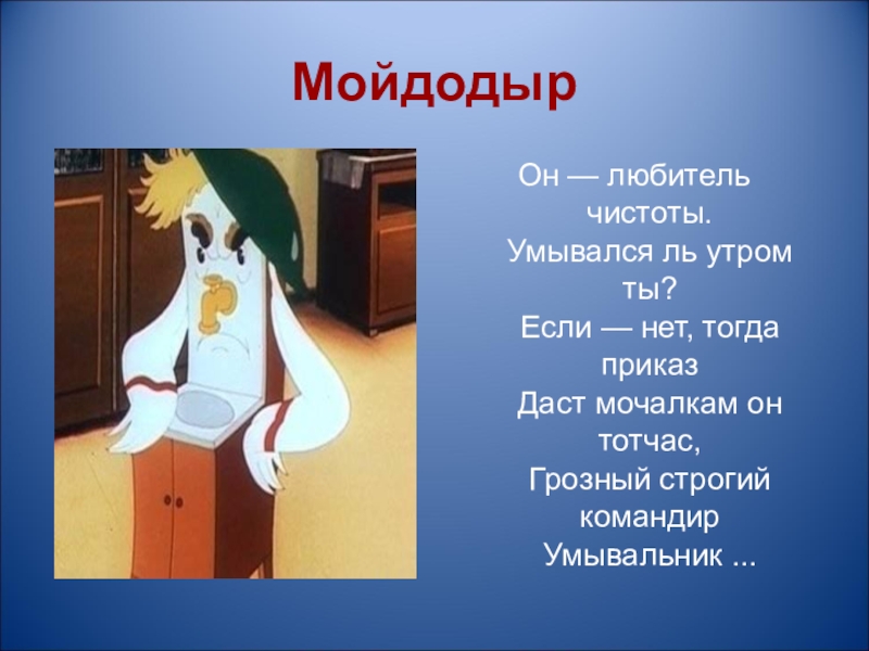МойдодырОн — любитель чистоты. Умывался ль утром ты? Если — нет, тогда приказ Даст мочалкам он тотчас,