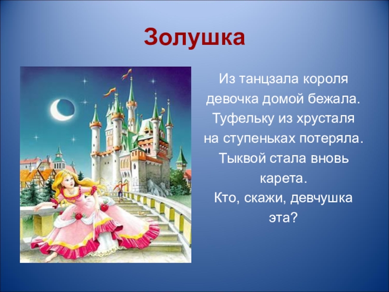 ЗолушкаИз танцзала королядевочка домой бежала.Туфельку из хрусталяна ступеньках потеряла.Тыквой стала вновькарета. Кто, скажи, девчушкаэта?