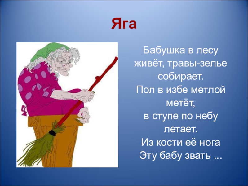 ЯгаБабушка в лесуживёт, травы-зельесобирает.Пол в избе метлойметёт,в ступе по небулетает.Из кости её ногаЭту бабу звать ...