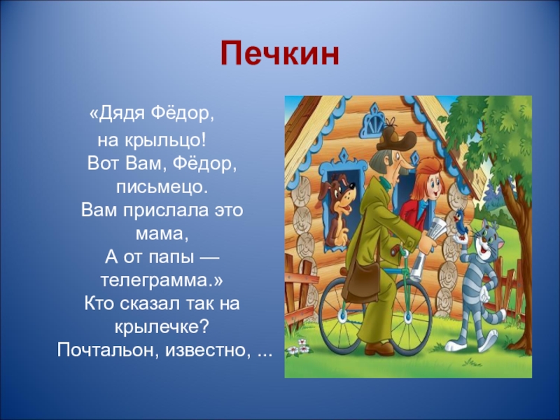 Печкин«Дядя Фёдор, на крыльцо! Вот Вам, Фёдор, письмецо. Вам прислала это мама, А от папы — телеграмма.»