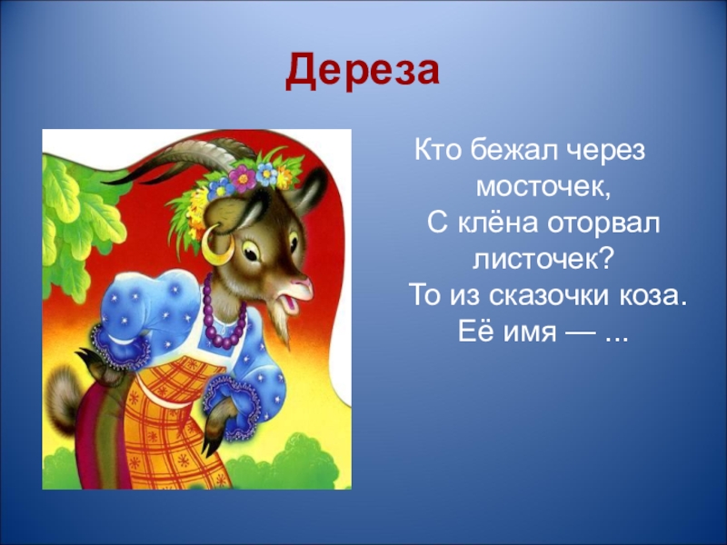 ДерезаКто бежал через мосточек, С клёна оторвал листочек? То из сказочки коза. Её имя — ...