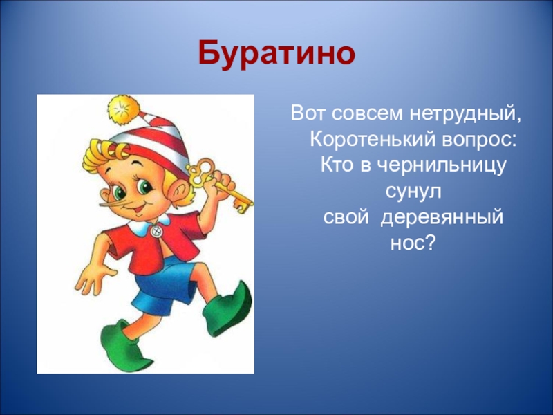 БуратиноВот совсем нетрудный, Коротенький вопрос: Кто в чернильницу сунул свой деревянный нос?