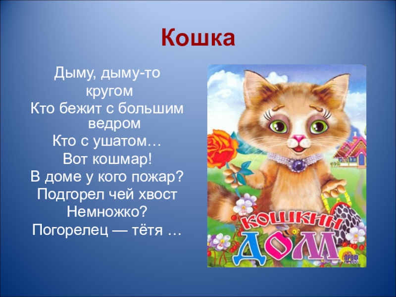 КошкаДыму, дыму-то кругомКто бежит с большим ведромКто с ушатом… Вот кошмар!В доме у кого пожар?Подгорел чей хвостНемножко?Погорелец