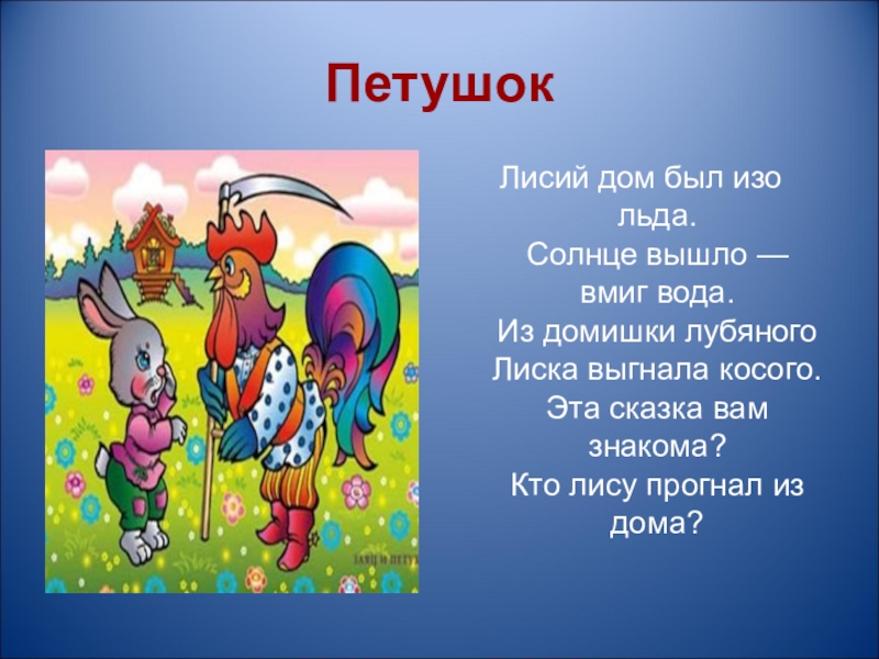 ПетушокЛисий дом был изо льда. Солнце вышло — вмиг вода. Из домишки лубяного Лиска выгнала косого. Эта