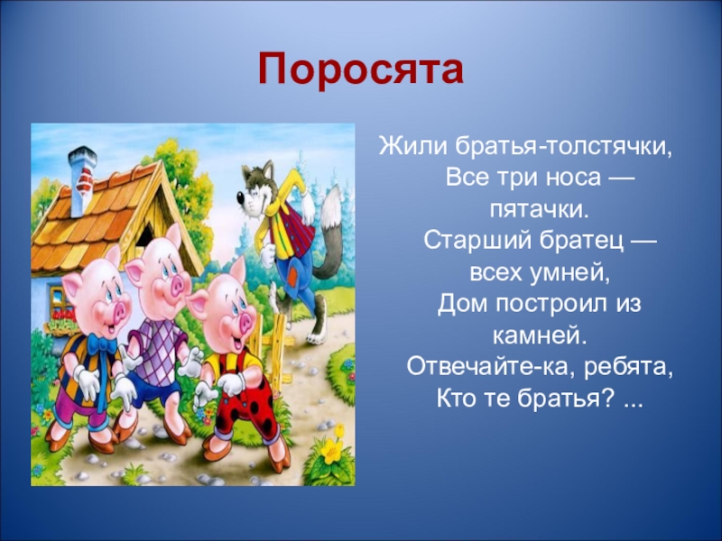 ПоросятаЖили братья-толстячки, Все три носа — пятачки. Старший братец — всех умней, Дом построил из камней. Отвечайте-ка,