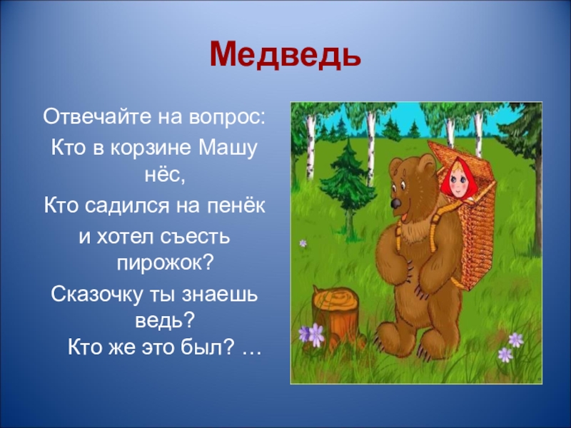 МедведьОтвечайте на вопрос:Кто в корзине Машу нёс,Кто садился на пенёки хотел съесть пирожок?Сказочку ты знаешь ведь? Кто
