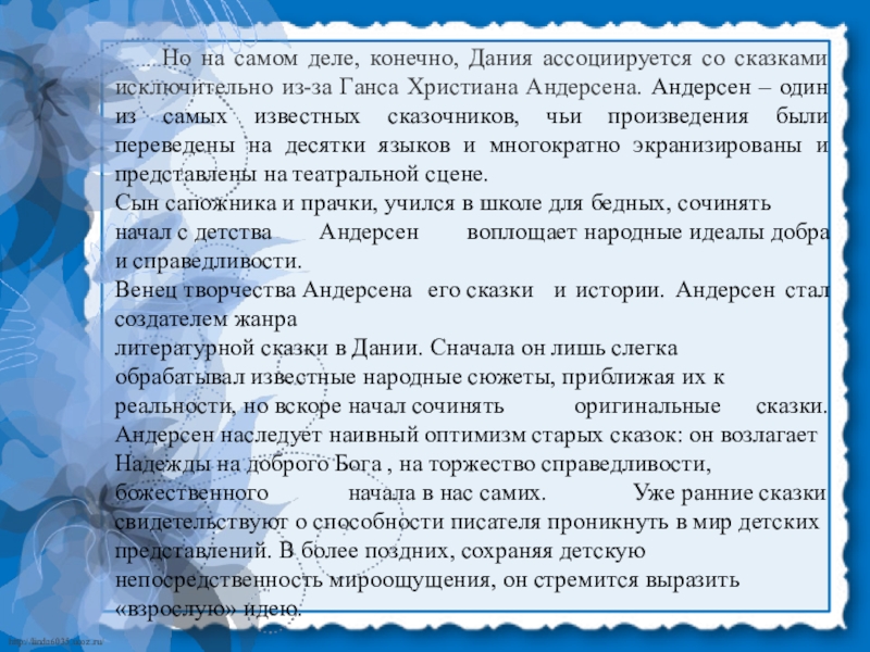 сказками исключительно из-за Ганса Христиана Андерсена. Андерсен – один из самых известных сказочников, чьи произведения были переведены на десятки языков и многократно экранизированы и представлены на театральной сцене.