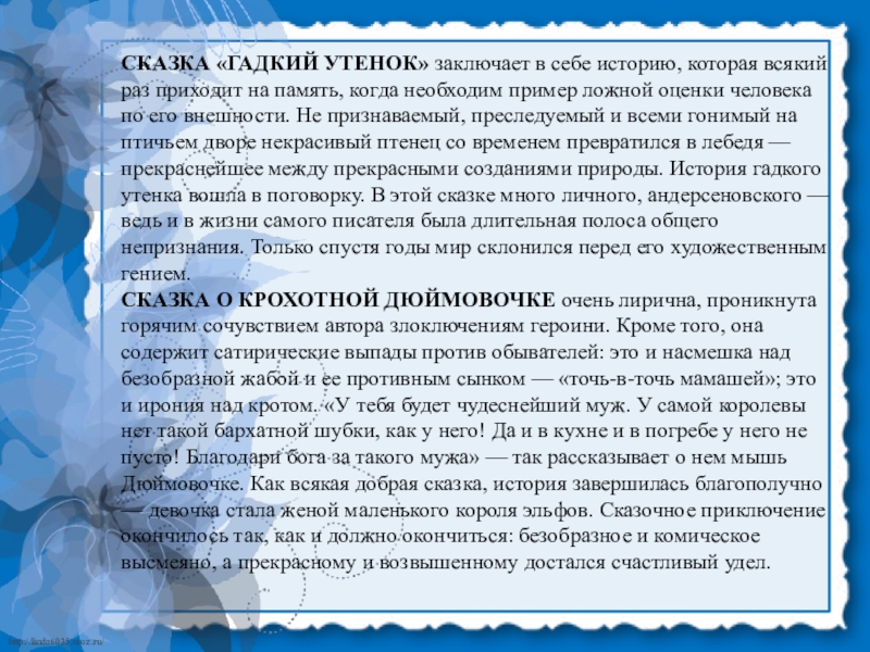 «замечательный талант» писателя и особо отметил, что реальные представления «чрезвычайно поэтически» принимают у Андерсена фантастический характер», что сказки писателя «не нуждаются в нравоучительном хвостике; они наводят детей на размышления, и применения рассказа делаются детьми уже самими, свободно без всякой натяжки».