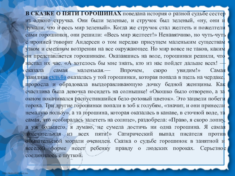 Слайд 8В СКАЗКЕ О ПЯТИ ГОРОШИНАХ поведана история о разной судьбе сестер из