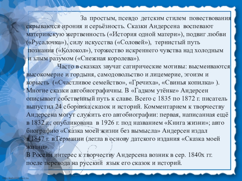 детским стилем повествования скрываются ирония и серьёзность. Сказки Андерсена воспевают