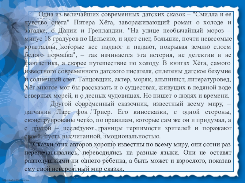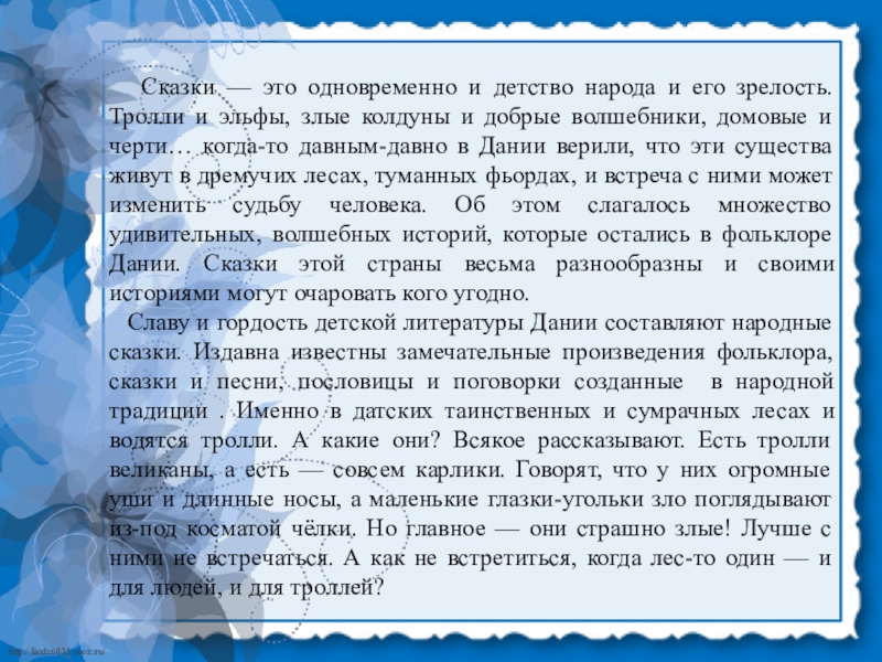 и его зрелость. Тролли и эльфы, злые колдуны и добрые волшебники, домовые и черти… когда-то давным-давно в Дании верили, что эти существа живут в дремучих лесах, туманных фьордах, и встреча с ними может изменить судьбу человека. Об этом слагалось множество удивительных, волшебных историй, которые остались в фольклоре Дании. Сказки этой страны весьма разнообразны и своими историями могут очаровать кого угодно.
