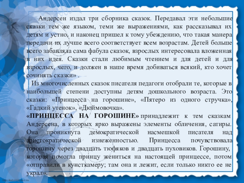 Из многочисленных сказок писателя педагоги отобрали те, которые в наибольшей степени доступны детям дошкольного возраста. Это сказки: «Принцесса на горошине», «Пятеро из одного стручка», «Гадкий утенок», «Дюймовочка».