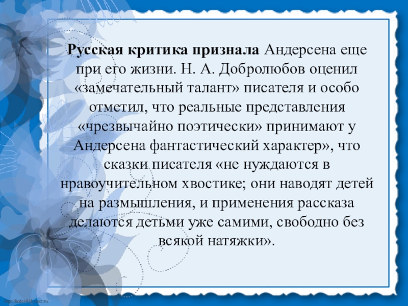 Слайд 10Русская критика признала Андерсена еще при его жизни. Н. А. Добролюбов оценил