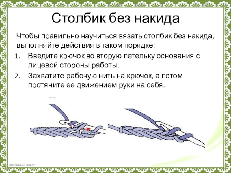 Столбик без накидаЧтобы правильно научиться вязать столбик без накида, выполняйте действия в таком порядке: Введите крючок во