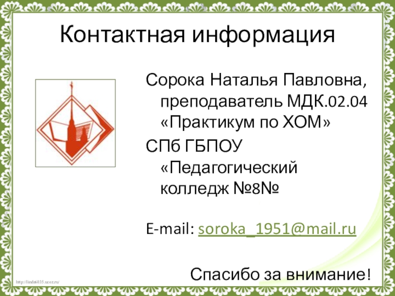 Контактная информацияСорока Наталья Павловна, преподаватель МДК.02.04 «Практикум по ХОМ»СПб ГБПОУ «Педагогический колледж №8№E-mail: soroka_1951@mail.ruСпасибо за внимание!