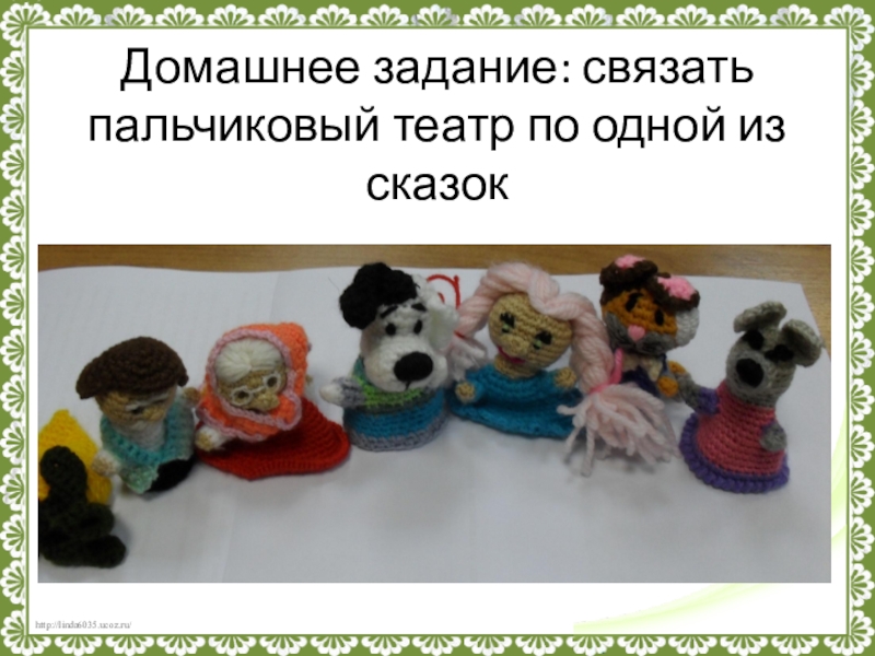 Слайд 14Домашнее задание: связать пальчиковый театр по одной из сказок