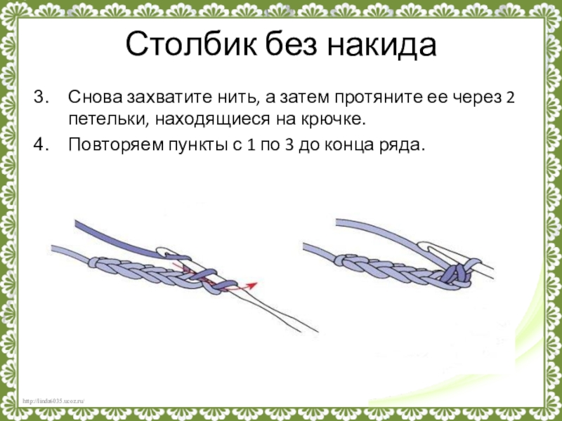 Столбик без накидаСнова захватите нить, а затем протяните ее через 2 петельки, находящиеся на крючке.  Повторяем пункты