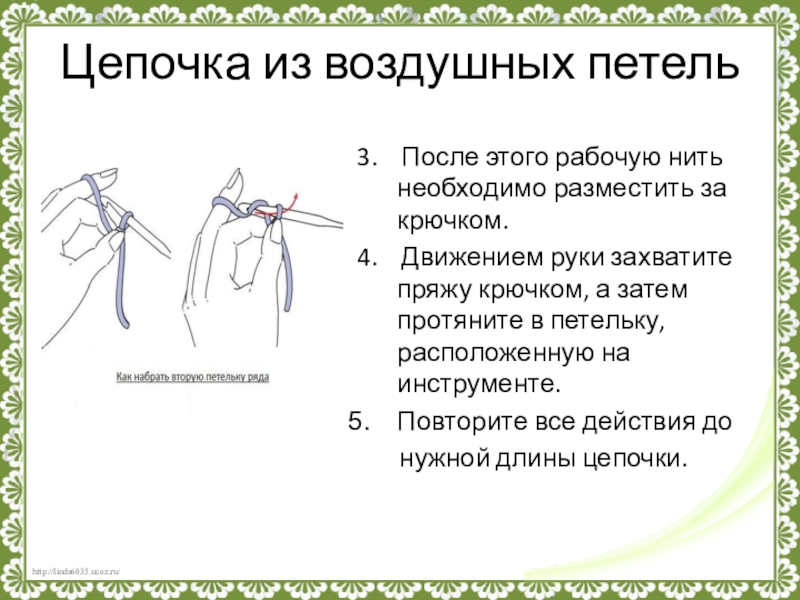 Цепочка из воздушных петель3.  После этого рабочую нить необходимо разместить за крючком.   4.  Движением