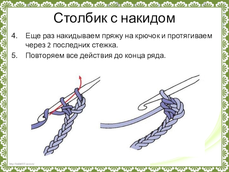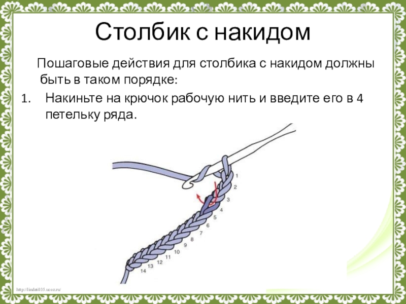 Столбик с накидом  Пошаговые действия для столбика с накидом должны быть в таком порядке: Накиньте на