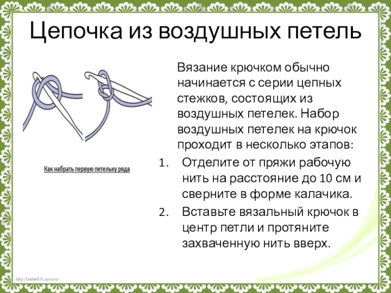 Цепочка из воздушных петель   Вязание крючком обычно начинается с серии цепных стежков, состоящих из воздушных