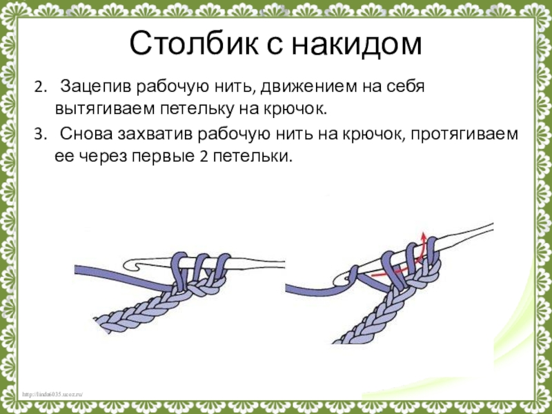 Столбик с накидом2.  Зацепив рабочую нить, движением на себя вытягиваем петельку на крючок. 3.  Снова