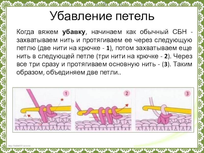 Убавление петельКогда вяжем убавку, начинаем как обычный СБН -захватываем нить и протягиваем ее через следующую петлю (две