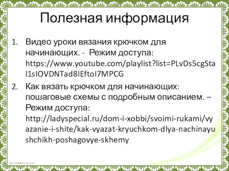 Полезная информацияВидео уроки вязания крючком для начинающих. - Режим доступа: https://www.youtube.com/playlist?list=PLvDs5cgStal1sIOVDNTad8IEftoI7MPCG Как вязать крючком для начинающих: пошаговые схемы