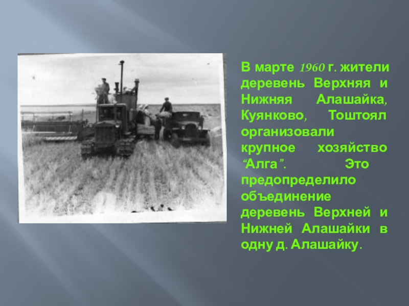 Тоштоял организовали крупное хозяйство “Алга”. Это предопределило объединение деревень Верхней и Нижней Алашайки в одну д. Алашайку.