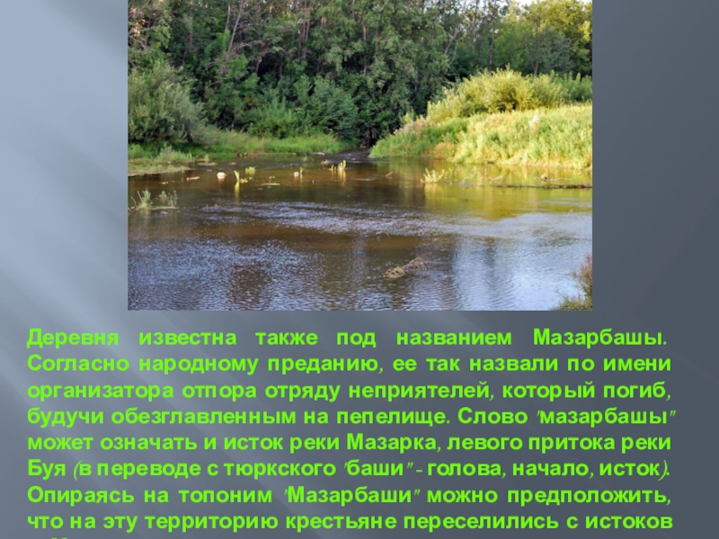 Слайд 16Деревня известна также под названием Мазарбашы. Согласно народному преданию, ее так