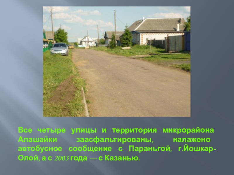 Слайд 19Все четыре улицы и территория микрорайона Алашайки заасфальтированы, налажено автобусное сообщение