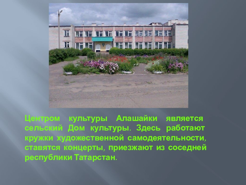 Слайд 20Центром культуры Алашайки является сельский Дом культуры. Здесь работают кружки художественной