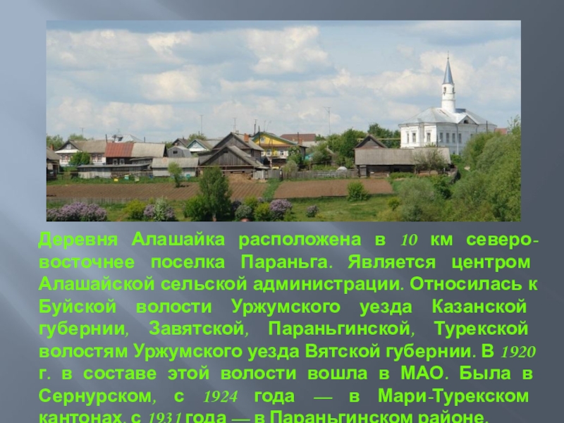 Слайд 15Деревня Алашайка расположена в 10 км северо-восточнее поселка Параньга. Является центром