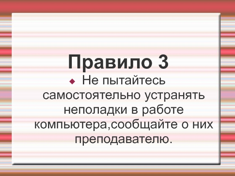 Правило 3Не пытайтесь самостоятельно устранять неполадки в работе компьютера,сообщайте о них преподавателю.