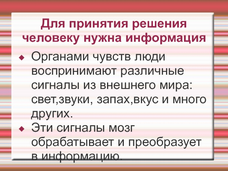 Для принятия решения человеку нужна информацияОрганами чувств люди воспринимают различные сигналы из внешнего мира: свет,звуки, запах,вкус и