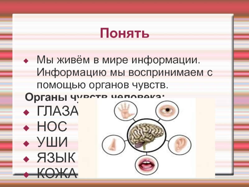 ПонятьМы живём в мире информации. Информацию мы воспринимаем с помощью органов чувств.Органы чувств человека:ГЛАЗАНОСУШИЯЗЫККОЖА