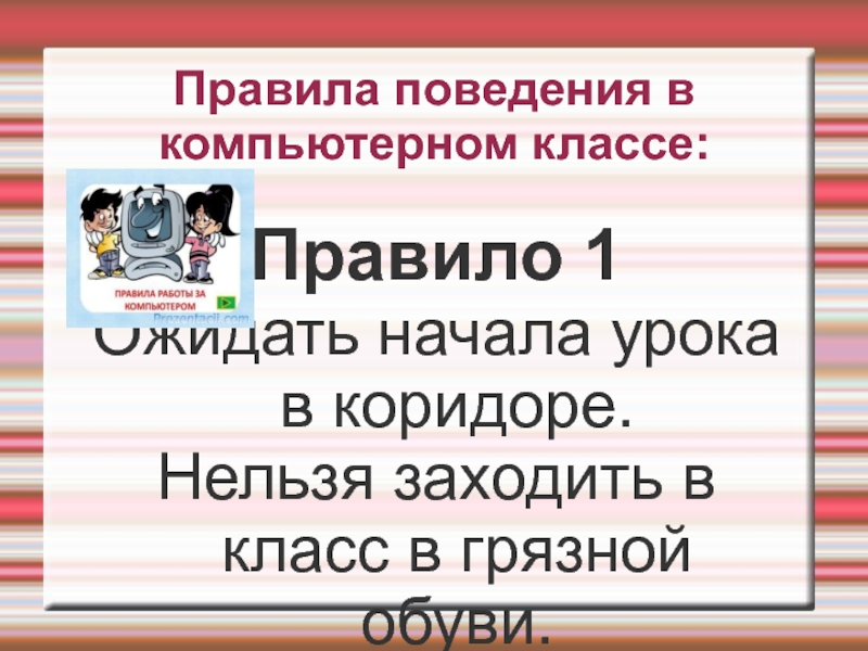 Правила поведения в компьютерном классе:Правило 1Ожидать начала урока в коридоре.Нельзя заходить в класс в грязной обуви.