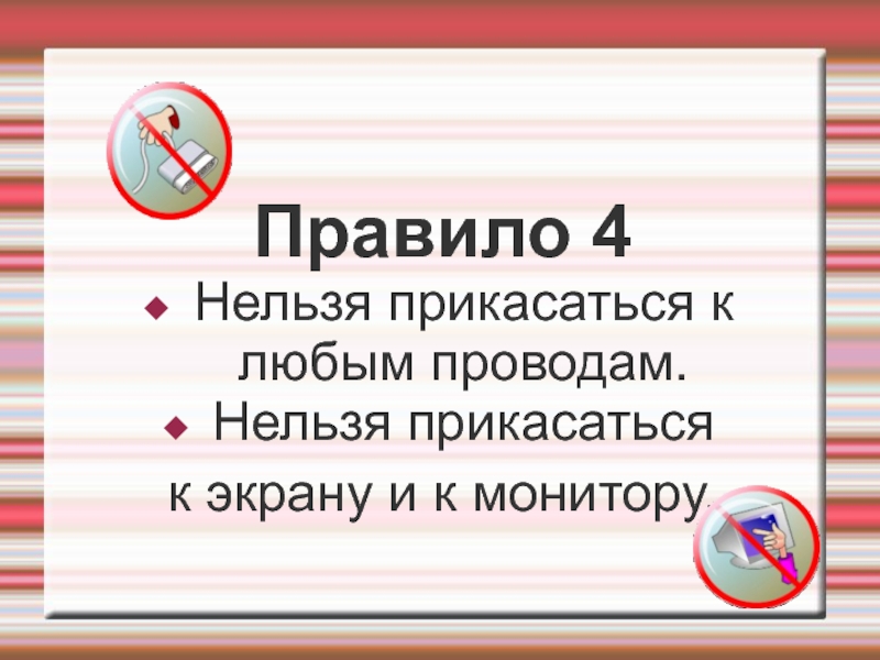 Правило 4Нельзя прикасаться к любым проводам.Нельзя прикасатьсяк экрану и к монитору.