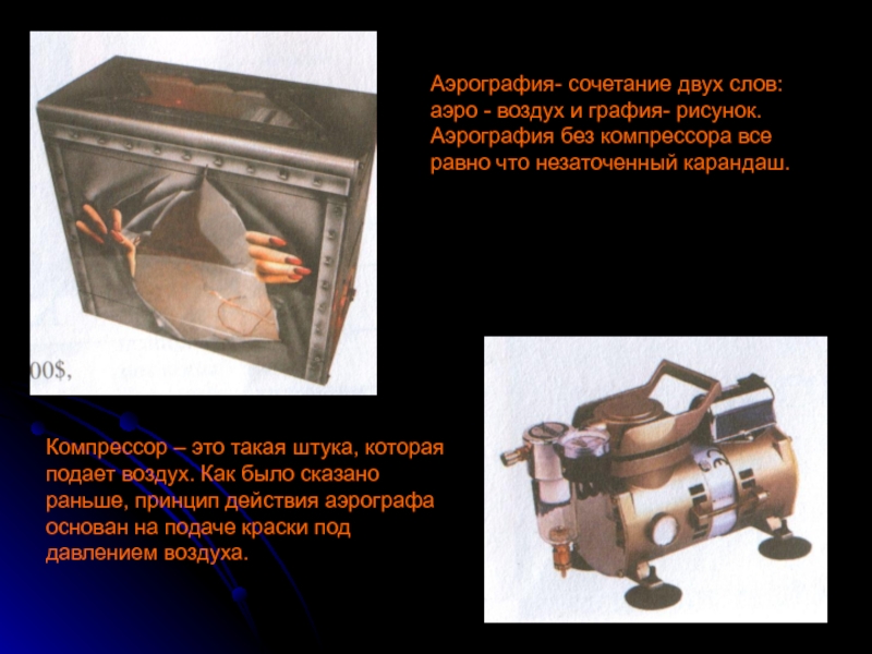 Компрессор – это такая штука, которая подает воздух. Как было сказано раньше, принцип действия аэрографа основан на подаче краски под давлением воздуха.
